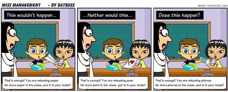 So what do we do? We don’t let kids misuse pens (writing notes to each other) and paper (making paper airplanes) in class https://pairadimes.davidtruss.com/miss-management/ … We place high expectations on their proper use! Keeping technology out of class won’t work nearly as well as placing high expectations of their use in class. Listen to Sonya: http://www.youtube.com/watch?v=kowGRhWAJeM